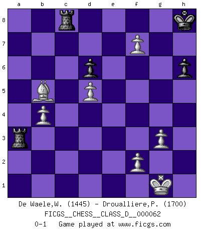Last move : 0-1 2007 November 2 11:21:15 [Event "FICGS__CHESS__CLASS_D__000062"] [Site "FICGS"] [Date "2007.10.12"] [Round "1"] [White "De Waele,Willy"] [Black "Droualliere,Philippe"] [Result "0-1"] [WhiteElo "1445"] [BlackElo "1700"] 1.e4 c5 2.Nf3 Nc6 3.d4 cxd4 4.Nxd4 Nf6 5.Nc3 e5 6.Ndb5 d6 7.Bg5 a6 8.Na3 b5 9.Bxf6 gxf6 10.Nd5 f5 11.Bd3 Be6 12.O-O Bxd5 13.exd5 Ne7 14.c3 Bg7 15.Qh5 e4 16.Be2 Qc8 17.Rfd1 Qc5 18.Rac1 O-O 19.b4 Qa7 20.Qh3 Qb6 21.c4 Bd4 22.Rf1 Rfc8 23.Rb1 Kg7 24.Qh5 h6 25.Rb3 f4 26.Rh3 Rh8 27.Nc2 Bf6 28.Re1 Bg5 29.Bf1 f5 30.g4 Ng8 31.gxf5 Nf6 32.Qd1 Rhg8 33.cxb5 Kh7 34.Qd4 Qc7 35.Rxe4 Nxe4 36.Qxe4 Rae8 37.Qd3 Bf6 38.Rg3 fxg3 39.hxg3 axb5 40.Nd4 Ra8 41.a3 Bxd4 42.f6 Kh8 43.Qxd4 Qa7 44.Qxa7 Rxa7 45.Bxb5 Rxa3 46.f7 Rc8 0-1 Sicilian : Pelikan (Lasker/Sveshnikov) variation Kingside Castling by player White (move 12) Kingside Castling by player Black (move 18) Player Black won this chess game. Follow this game move after move (download)We cannot resist the fascination of sacrifice, since a passion for sacrifices is part of a Chessplayer's nature. (Rudolf Spielman) Wer nie einen Fehler gemacht hat, hat nie etwas Neues ausprobiert. (Albert Einstein) Si pudieramos observar el interior de la cabeza de un jugador de Ajedrez, encontraríamos ahí un mundo lleno de sentimientos, imágenes, ideas, emoción y pasión. (Alfred Binet) Pour moi, les échecs ne sont pas un jeu mais un art. (Alexandre Alekhine) A woman without a man is like a fish without a bicycle. (Gloria Steinem)