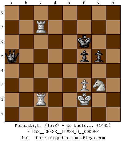 Last move : 1-0 2008 January 3 17:14:30 [Event "FICGS__CHESS__CLASS_D__000062"] [Site "FICGS"] [Date "2007.10.12"] [Round "1"] [White "Kolawski,Christof"] [Black "De Waele,Willy"] [Result "1-0"] [WhiteElo "1572"] [BlackElo "1445"] 1.e4 c5 2.Nf3 d6 3.d4 cxd4 4.Nxd4 Nf6 5.Nc3 a6 6.Be3 e6 7.f3 b5 8.g4 b4 9.Nce2 h6 10.Qd2 e5 11.Nb3 a5 12.Rd1 a4 13.Nbc1 Nc6 14.Ng3 Qa5 15.Nf5 Bxf5 16.gxf5 d5 17.exd5 Rd8 18.Bc4 Bc5 19.Qe2 Bxe3 20.Qxe3 Ne7 21.Rg1 Kf8 22.Qxe5 Qc5 23.Qd4 Qd6 24.Bd3 Qxh2 25.Be4 Nexd5 26.Rd2 Qb8 27.R1g2 h5 28.Ne2 h4 29.c4 h3 30.Rg1 Rh4 31.Rh1 h2 32.cxd5 Rxd5 33.Bxd5 Rxd4 34.Rxd4 a3 35.bxa3 Nxd5 36.Rxd5 b3 37.axb3 Qxb3 38.Rd7 Ke8 39.Rc7 Qxa3 40.Kf2 Qa5 41.Rc4 Qxf5 42.Rxh2 g5 43.Rh8+ Ke7 44.Ng3 Qa5 45.Rc2 f5 46.Rh7+ Kf6 47.Rhc7 1-0 Sicilian : Najdorf, Byrne (English) attack 10 pieces endgame at move 41 : White KRRNP , Black KQPPP WHITE : King + 2 Rooks 1 Knight 1 Pawn BLACK : King + 1 Queen 3 Pawns 9 pieces endgame at move 42 : White KRRNP , Black KQPP WHITE : King + 2 Rooks 1 Knight 1 Pawn BLACK : King + 1 Queen 2 Pawns Player White won this chess game. Follow this game move after move (download)Bobby Fischer is the greatest Chess genius of all time ! (Alexander Kotov) Alle Schachspieler sollten auch ein Hobby haben. (Savielly Grigorievitsch Tartakower) El hombre es un frívolo, una creatura engañosa y como un jugador de Ajedrez, se preocupa mas por el proceso de obtener su meta que de la meta por sí misma. (Dostoyevsky) Ce qui caractérise les parties de combat, c'est que si le défenseur a constamment de difficiles problèmes à résoudre, l'attaquant doit chercher sans relâche de nouvelles possibilités d'attaque. (Koblentz) It's unlucky to be superstitious. (Dave Enteles)