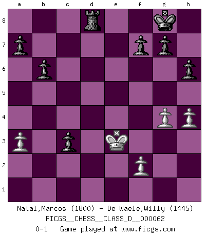 Last move : 0-1 2008 February 26 15:54:55 [Event "FICGS__CHESS__CLASS_D__000062"] [Site "FICGS"] [Date "2007.10.12"] [Round "1"] [White "Natal,Marcos"] [Black "De Waele,Willy"] [Result "0-1"] [WhiteElo "1800"] [BlackElo "1445"] 1.d4 d5 2.c4 c6 3.Nc3 Nf6 4.Nf3 e6 5.Bg5 h6 6.Bxf6 Qxf6 7.e4 dxe4 8.Nxe4 Bb4+ 9.Ke2 Qf4 10.Qd3 Be7 11.g3 Qc7 12.Bg2 O-O 13.Rhe1 Rd8 14.Rad1 c5 15.d5 exd5 16.cxd5 b6 17.Kf1 Ba6 18.d6 Bxd6 19.Qxa6 Nxa6 20.Nxd6 Rxd6 21.Nd4 Qd8 22.Nc6 Rxd1 23.Nxd8 Raxd8 24.a3 c4 25.Bf3 Rxe1+ 26.Kxe1 Nc5 27.Be2 Nd3+ 28.Kd2 Nf4 29.Ke3 Re8+ 30.Kxf4 Rxe2 31.Kf3 Rxb2 32.h4 Rd2 33.Ke3 c3 34.g4 Rd8 0-1 QGD Slav defense Kingside Castling by player Black (move 12) Player Black won this chess game. Follow this game move after move (download)Pawn endings are to Chess what putting is to golf. (Cecil Purdy) Fischer: 'Remis!?' Uhlmann: 'Aber es muss doch dreimal Zugwiederholung sein!' Fischer: 'Sie nehmen das Remis an, wie ich es sage, sonst spiele ich weiter und werde Sie dann schlagen!' (Robert James Fischer) Bobby Fischer es el mas grande genio de Ajedrez de todos los tiempos. (Alexander Kotov) Il n'y a plus de joueurs du niveau de Jacob Murray dont la seule quête est le beau jeu, le plaisir de voir les pièces construire quelque chose. Sur 10 idées à la minute, 9 seront sans intérêt, la dernière s'avèrera géniale. (Christian Bauer) Before all elsed, be armed. (Niccolo Machiavelli)