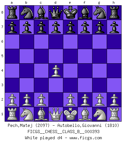 First move 2026 March 16 19:31:19 White clock - 39 days 18:23:04 Black clock - 40 days 00:00:00 [Event "FICGS__CHESS__CLASS_B__000393"] [Site "FICGS"] [Date "2026.03.16"] [Round "1"] [White "Pech,Matej"] [Black "Autobello,Giovanni"] [Result "*"] [WhiteElo "2097"] [BlackElo "1810"] 1.* Follow this game move after move (download)He who takes the Queen's Knight's Pawn will sleep in the streets. (Anonymous) Obendrein hat der FIDE-Präsident den Revolutionsführer Gaddafi zum »Großmeister« ernannt, am Ende der WM. Das ist lächerlich! (Joel Lautier) Todo se encuentra en un estado de flujo y esto incluye al mundo del Ajedrez. (Mikhail Botvinnik) Psychologiquement, tu dois avoir confiance en toi même, mais cette confiance doit être basée sur des faits. (Robert Fischer) A bird doesn't sing because it has an answer, it sings because it has a song. (Maya Angelou)