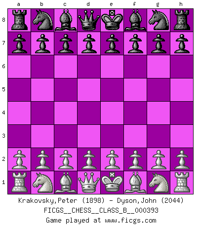 First move 2026 March 16 19:31:19 White clock - 39 days 20:46:15 Black clock - 40 days 00:00:00 [Event "FICGS__CHESS__CLASS_B__000393"] [Site "FICGS"] [Date "2026.03.16"] [Round "1"] [White "Krakovsky,Peter"] [Black "Dyson,John"] [Result "*"] [WhiteElo "1898"] [BlackElo "2044"] 1.* Follow this game move after move (download)Look at Garry Kasparov. After he loses, invariably he wins the next game. He just kills the next guy. That's something that we have to learn to be able to do. (Maurice Ashley) Über Karpov: Er war und ist ein Vertreter der russischen Reaktionäre. Das steckt tief in seiner Seele, wehalb ich nicht nett mit ihm umgehen kann. (Viktor Kortschnoi) Hoy en día, si tu no eres un Gran Maestro a los 14 años, es mejor que lo olvides. (Anand Viswanathan) Des combinaisons [dans le jeu d'échecs] pareilles à des mélodies. Je crois entendre pour ainsi dire la musique des coups... (Vladimir Nabokov) The next best thing to gambling and winning is gambling and loosing. (Nick Dandalos)