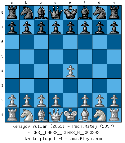 Last move : e4 2026 March 16 19:36:2 White clock - 39 days 23:55:17 Black clock - 39 days 19:10:02 [Event "FICGS__CHESS__CLASS_B__000393"] [Site "FICGS"] [Date "2026.03.16"] [Round "1"] [White "Kehayov,Yulian"] [Black "Pech,Matej"] [Result "*"] [WhiteElo "2053"] [BlackElo "2097"] 1.e4 * Follow this game move after move (download)You cannot play at Chess if you are kind-hearted. (French Proverb) Darum geht es im Schach. Einen Tag gibst du deinem Gegner eine Lektion, am nächsten Tag gibt er dir eine. (Robert James Fischer) El Ajedrez es una guerra en un tablero. El objetivo es aplastar la mente del oponente. (Bobby Fischer) Le moment que je préfère le plus dans une rencontre, c'est celui où je sens que la personnalité de l'adversaire se brise. (Robert Fischer) It's not the size of the dog in the fight, it's the size of the fight in the dog. (Mark Twain)