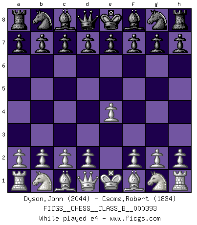 First move 2026 March 16 19:31:19 White clock - 39 days 20:46:16 Black clock - 40 days 00:00:00 [Event "FICGS__CHESS__CLASS_B__000393"] [Site "FICGS"] [Date "2026.03.16"] [Round "1"] [White "Dyson,John"] [Black "Csoma,Robert"] [Result "*"] [WhiteElo "2044"] [BlackElo "1834"] 1.* Follow this game move after move (download)The Pin is mightier than the sword. (Fred Reinfeld) Im Blitz ist es einfacher mit einer Figur weniger anzugreifen, als sich mit einer Mehrfigur zu verteidigen. (Mikhail Nekhemyevich Tal) Muchos se han convertido en Maestros de Ajedrez, nadie se ha convertido en el Maestro del Ajedrez. (Siegbert Tarrasch) Le pion, dans sa simplicité, marche droit devant lui, mais lorsqu'il prend, il le fait obliquement? Ainsi l'homme, tant qu'il reste pauvre, marche dans la droiture et vit honnêtement, mais lorsqu'il recherche les honneurs, il flatte, se parjure et, par les voies obliques, cherche une position supérieure sur l'échiquier du monde. (Jean de Galles) Art is the triumph over chaos. (John Cheever)