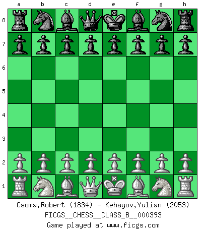 First move 2026 March 16 19:31:19 White clock - 39 days 19:05:17 Black clock - 40 days 00:00:00 [Event "FICGS__CHESS__CLASS_B__000393"] [Site "FICGS"] [Date "2026.03.16"] [Round "1"] [White "Csoma,Robert"] [Black "Kehayov,Yulian"] [Result "*"] [WhiteElo "1834"] [BlackElo "2053"] 1.* Follow this game move after move (download)Do you realize Fischer almost never has any bad pieces? He exchanges them, and the bad pieces remain with his opponents. (Yuri Balashov) Obwohl ich alt bin, darf mir niemand den Finger in den Mund stecken, sonst beisse ich. (Wilhelm Steinitz) El Ajedrez hace al hombre ser mas sabio y ver mas claro. (Vladimir Putin) Même un GMI sait rarement calculer sur plus de cinq coups une attaque à sacrifices. (Rudolf Spielmann) You lose, general Kenobi. (General Grievous in Star Wars ep.3)