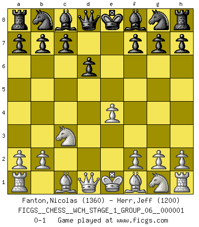 Last move : 0-1 2006 August 11 17:21:28 [Event "FICGS__CHESS__WCH_STAGE_1_GROUP_06__000001"] [Site "FICGS"] [Date "2006.07.01"] [Round "1"] [White "Fanton,Nicolas"] [Black "Herr,Jeff"] [Result "0-1"] [WhiteElo "1360"] [BlackElo "1200"] 1.e4 e5 2.d4 exd4 3.c3 dxc3 4.Nxc3 d6 0-1 This chess game has been lost on time (started : 2006.07.01 16:7:34) Danish gambit Player Black won this chess game. Follow this game move after move (download)Who is your opponent tonight, tonight I am playing against the Black pieces. (Akiba Rubinstein) Fallen sollten polizeilich verboten werden. (Savielly Grigorievitsch Tartakower) Mi estilo es algo parecido entre un poco de Tal y Petrosian. (Reshevsky) Je menace de comprendre la position. (Anonyme) The quality of decision is like the well-timed swoop of a falcon which enables it to strike and destroy its victim. (Sun Tzu)