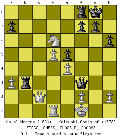 Last move : 0-1 2008 April 24 20:28:21 [Event "FICGS__CHESS__CLASS_D__000062"] [Site "FICGS"] [Date "2007.10.12"] [Round "1"] [White "Natal,Marcos"] [Black "Kolawski,Christof"] [Result "0-1"] [WhiteElo "1800"] [BlackElo "1572"] 1.d4 Nf6 2.c4 e6 3.Nc3 Bb4 4.a3 Bxc3+ 5.bxc3 c5 6.Nf3 O-O 7.Bg5 h6 8.Bxf6 Qxf6 9.e4 d6 10.Be2 e5 11.O-O cxd4 12.cxd4 Nc6 13.d5 Na5 14.Qa4 b6 15.Rad1 Nb7 16.Qc6 Rb8 17.Nd2 Nc5 18.Qb5 Qg5 19.Bf3 Ba6 20.Qb2 b5 21.Qc2 bxc4 22.Nxc4 Nb3 23.Nxd6 Bxf1 24.Kxf1 Nd4 25.Qd3 Rb3 26.Qd2 Nxf3 27.gxf3 Qh5 28.Qc2 Qxf3 0-1 This chess game has been lost on time (started : 2007.10.12 17:40:33) Nimzo-Indian : Saemisch variation Kingside Castling by player Black (move 6) Kingside Castling by player White (move 11) Player Black won this chess game. Follow this game move after move (download)Chess is played with the mind and not with the hands ! (Renaud and Kahn) Ich verstehe Aljechins Kombinationen ganz gut; aber woher er diese Angriffschancen bekommt und wie er die Eröffnung behandelt das ist für mich ein Buch mit sieben Siegeln. (Rudolf Spielmann) El jugador blanco perdió porque fallo en recordar la coreccta continuación y tuvo que pensar por sí mismo las movidas. (Siegbert Tarrasch) Demandez au pauvre Cg1 ce qu'il en pense. Eduard Gufeld à propos de la variante Saemisch de l'Est-Indienne. At work, the authority of a person is inversely proportional to the number of pens that person is carrying. (Dan Rotaru)