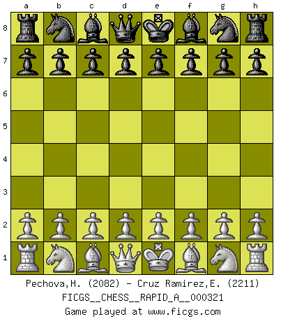 First move 2026 March 18 21:33:30 Hana Pechova ... is in vacation until 2026 March 20 4:53:33 Eliecer Cruz Ramirez ... is in vacation until 2026 April 8 23:40:47 White clock - 29 days 21:14:43 Black clock - 30 days 00:00:00 [Event "FICGS__CHESS__RAPID_A__000321"] [Site "FICGS"] [Date "2026.03.18"] [Round "1"] [White "Pechova,Hana"] [Black "Cruz Ramirez,Eliecer"] [Result "*"] [WhiteElo "2082"] [BlackElo "2211"] 1.* Follow this game move after move (download)Chess is a sea in which a gnat may drink and an elephant may bathe. (Hindu proverb) Am wohlsten fühle ich mich, wenn ich sehe, wie sich mein Gegner im Todeskampf windet. (Robert James Fischer) Las leyes del Ajedrez no permiten una libre elección: tienes que mover quieras o no. (Emanuel Lasker) Il n'y a plus de joueurs du niveau de Jacob Murray dont la seule quête est le beau jeu, le plaisir de voir les pièces construire quelque chose. Sur 10 idées à la minute, 9 seront sans intérêt, la dernière s'avèrera géniale. (Christian Bauer) Never was anything great achieved without danger. (Niccolo Machiavelli)