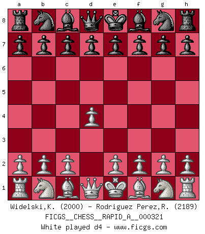 Last move : d4 2026 March 19 12:1:22 White clock - 30 days 09:32:08 Black clock - 29 days 22:21:57 [Event "FICGS__CHESS__RAPID_A__000321"] [Site "FICGS"] [Date "2026.03.18"] [Round "1"] [White "Widelski,Kacper"] [Black "Rodriguez Perez,Rene"] [Result "*"] [WhiteElo "2000"] [BlackElo "2189"] 1.d4 * Follow this game move after move (download)One of these modest little moves may be more embarrassing to your opponent than the biggest threat. (Siegbert Tarrasch) Kein Großmeister ist normal. Sie unterscheiden sich nur im Ausmaß Ihrer Verrücktheit. (Viktor Kortschnoi) En un gambito tu regalas un Peón por el bién de tomar un juego perdido. (Samuel Standige Boden) Pour moi, les échecs ne sont pas un jeu mais un art. (Alexandre Alekhine) Every vice is only an exaggeration of a necessary and virtuous function. (Ralph Waldo Emerson, Journals 1936)