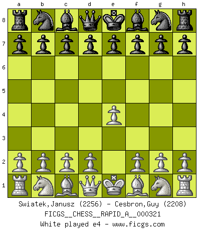 Last move : e4 2026 March 19 0:10:24 White clock - 30 days 21:23:06 Black clock - 29 days 12:22:51 [Event "FICGS__CHESS__RAPID_A__000321"] [Site "FICGS"] [Date "2026.03.18"] [Round "1"] [White "Swiatek,Janusz"] [Black "Cesbron,Guy"] [Result "*"] [WhiteElo "2256"] [BlackElo "2208"] 1.e4 * Follow this game move after move (download)Even the laziest King flees wildly in the face of a double check ! (Aaron Nimzowitsch) Ein unbeabsichtigtes Patt ist der Gipfel der Dummheit. (Anonymous) Un buen jugador siempre tiene buena suerte. (José Raúl Capablanca) Les Echecs, c'est l'art de la guerre sans les charniers, c'est la résurrection des morts tombés au champ d'honneur, l'espoir perpétuel, la suprématie de l'intelligence sur la force, la culture de l'esprit. (F. Szpiner) Fame, I have already. Now I need the money. (an elderly Steinitz)