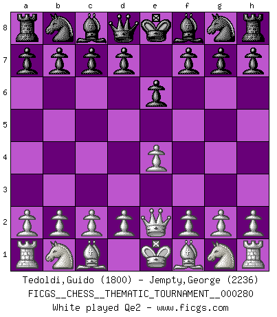 Last move : Qe2 2026 March 20 17:44:33 White clock - 40 days 00:00:00 Black clock - 39 days 18:08:27 [Event "FICGS__CHESS__THEMATIC_TOURNAMENT__000280"] [Site "FICGS"] [Date "2026.03.20"] [Round "1"] [White "Tedoldi,Guido"] [Black "Jempty,George"] [Result "*"] [WhiteElo "1800"] [BlackElo "2236"] 1.e4 e6 2.Qe2 * Follow this game move after move (download)The game of chess is the touchstone of the intellect. (Goethe) Nie in meinem Leben habe ich die französische Verteidigung gespielt, welche die Stumpfsinnigste von allen ist. (Wilhelm Steinitz) No solamente yo pronostico su triunfo sobre Botvinnik, sino que me adelanto y digo que probablemente Fischer es el jugador de Ajedrez mas grande que haya existido. (John Collins) Avec des compensations pour le matériel en plus... (Anonyme) Only sick music makes money today. (Friedrich Nietzsche)