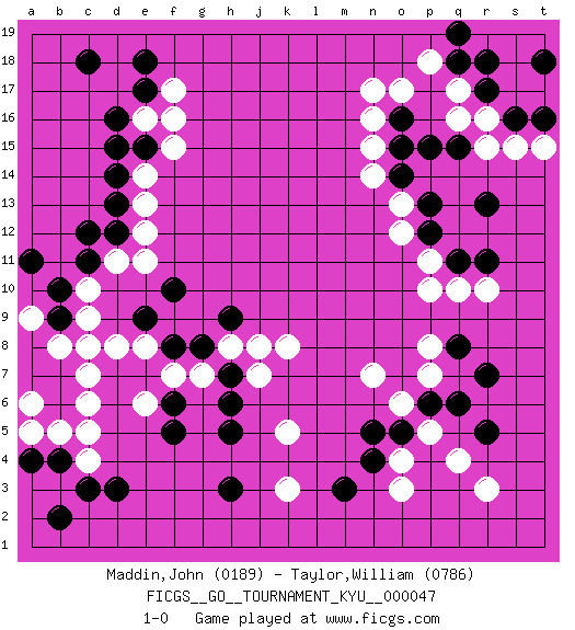 Last move : 1-0 2008 April 7 7:7:51 [Event "FICGS__GO__TOURNAMENT_KYU__000047"] [Site "FICGS"] [Date "2007.10.15"] [Round "1"] [Black "Maddin,John"] [White "Taylor,William"] [Result "1-0"] [Rating 1 "0189"] [Rating 2 "0786"] 1.d16 r3 2.d3 q16 3.r7 c5 4.b4 c4 5.c3 b5 6.a4 a5 7.b2 c10 8.c8 b8 9.b7 c7 10.b9 d8 11.a8 c9 12.b10 b8 13.b6 c8 14.c11 d11 15.c12 c6 16.a7 a6 17.a11 a9 18.d12 e11 19.e9 e8 20.f8 f7 21.f10 e12 22.d13 k3 23.m3 o3 24.h3 k5 25.h5 j7 26.h7 h8 27.g8 g7 28.h6 k8 29.h9 j8 30.f6 e6 31.f5 r10 32.r13 n17 33.r17 r16 34.s16 s15 35.t16 q17 36.r18 t15 37.t18 r15 38.q18 p18 39.q19 p10 40.q11 q10 41.r11 p11 42.p12 o12 43.p13 o13 44.p15 n15 45.o16 o17 46.o15 n16 47.o14 n14 48.q15 p7 49.n5 p5 50.r5 q4 51.q8 p8 52.q6 n7 53.p6 o6 54.o5 o4 55.n4 f17 56.c18 f15 57.e15 e14 58.d14 e16 59.d15 e13 60.e17 f16 61.e18 1-0 This go game has been lost on time (started : 2007.10.15 16:28:57) Here are the names of the openings (joseki) played in the four corners : Corner q4 : r3 r7 San-San (Sam-Sam, San-San) 3-3 Point. The San-San (3-3) point, emphasizing territory at the expense of influence. Corner d4 : d3 c5 Komoku (Somok, Xiao~mu`) 3-4 Point. The komoku (3-4) point is the traditional corner enclosure move.. Ikken Kakari (Hankan Keolch'im, Yi Gua`jiao~, 1-Space Low Pincer). The small knight move is the basic approach move to the 3-4 point stone. It has been continually used for over four centuries. There are limitless variations, with new moves constantly being discovered. White 2 opens the door to a treaure store of joseki. Corner q16 : q16 r13 Hoshi (Hwajeom, Seongjeom, Xingwei`) 4-4 Point. The star or hoshi (4-4) point, emphasizing influence at the potential expense of territory. Nikken Kakari (Dukan Keolch'im, E`r Gua`jiao~, 2-Space Low Approach). White typically answers by 7-3 or 3-5 (which is not joseki). Player Black won this Go (weiqi, baduk) game. Follow this game move after move (download)If you have won four corners, resign. (Anonymous) I don't diet. I just don't eat as much as I'd like to. (Linda Evangelista, supermodel)