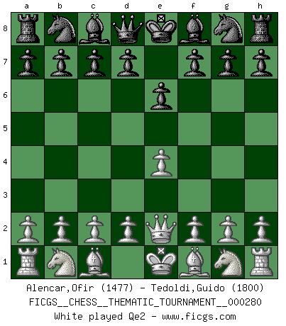 Last move : Qe2 2026 March 20 17:44:33 White clock - 40 days 00:00:00 Black clock - 39 days 18:08:28 [Event "FICGS__CHESS__THEMATIC_TOURNAMENT__000280"] [Site "FICGS"] [Date "2026.03.20"] [Round "1"] [White "Alencar,Ofir"] [Black "Tedoldi,Guido"] [Result "*"] [WhiteElo "1477"] [BlackElo "1800"] 1.e4 e6 2.Qe2 * Follow this game move after move (download)In complicated positions, Bobby Fischer hardly had to be afraid of anybody. (Paul Keres) Wer nie einen Fehler gemacht hat, hat nie etwas Neues ausprobiert. (Albert Einstein) Juega la Apertura como un libro, el Juego Medio como un mago y los Finales como una máquina. (Spielmann) Les écrivains ont utilisé les échecs pour analyser les côtés extrêmes de la nature humaine. Dans ce cadre, les échecs offrent un champ d'expérimentation idéal. Mais on pourrait faire la même chose avec la peinture. Et là, en vous référant à Van Gogh, vous ne tirerez pas de conclusion définitive sur les peintres. (Gary Kasparov) Horse racing is animated roulette. (Roger Kahn)