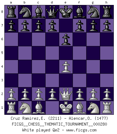 Last move : Qe2 2026 March 20 17:44:33 Eliecer Cruz Ramirez ... is in vacation until 2026 April 8 23:40:47 White clock - 40 days 00:00:00 Black clock - 39 days 19:43:53 [Event "FICGS__CHESS__THEMATIC_TOURNAMENT__000280"] [Site "FICGS"] [Date "2026.03.20"] [Round "1"] [White "Cruz Ramirez,Eliecer"] [Black "Alencar,Ofir"] [Result "*"] [WhiteElo "2211"] [BlackElo "1477"] 1.e4 e6 2.Qe2 * Follow this game move after move (download)Play the opening like a book, the middle game like a magician, and the endgame like a machine. (Spielmann) Karpov ist ein Museumsstück. (Garry Kasparov) El ganador de una partida es aquel jugador que hace el penúltimo error. (Savielly Tartakover) Nous vivons dans un monde échiquéen : chaque jour qui passe est un défi à relever. (Philosophe Sasha) When you have everything, sometimes it feels like nothing. (Horatio Caine, C.S.I. Miami)