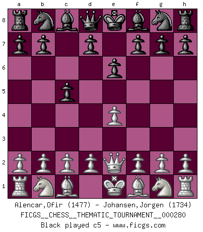 Last move : c5 2026 March 20 17:48:22 White clock - 39 days 18:12:16 Black clock - 39 days 23:56:11 [Event "FICGS__CHESS__THEMATIC_TOURNAMENT__000280"] [Site "FICGS"] [Date "2026.03.20"] [Round "1"] [White "Alencar,Ofir"] [Black "Johansen,Jorgen"] [Result "*"] [WhiteElo "1477"] [BlackElo "1734"] 1.e4 e6 2.Qe2 c5 3.* Follow this game move after move (download)It is difficult to play against Einstein's theory --on his first loss to Fischer. (Mikhail Tal) Ich habe kein Problem mit Frauen, sondern nur mit dem Niveau ihres Schachspiels (Judith Polgar) Si no le temes a Spassky, entonces elimino el elemento del dinero. (Jim Slater) Seul un grand joueur sait à quel point il joue faiblement. (Xavier Tartacover) Two beer, or not two beer. (Unknown)