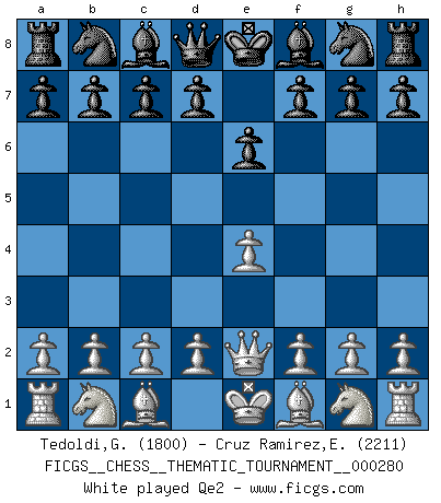 Last move : Qe2 2026 March 20 17:44:33 Eliecer Cruz Ramirez ... is in vacation until 2026 April 8 23:40:47 White clock - 40 days 00:00:00 Black clock - 40 days 00:00:00 [Event "FICGS__CHESS__THEMATIC_TOURNAMENT__000280"] [Site "FICGS"] [Date "2026.03.20"] [Round "1"] [White "Tedoldi,Guido"] [Black "Cruz Ramirez,Eliecer"] [Result "*"] [WhiteElo "1800"] [BlackElo "2211"] 1.e4 e6 2.Qe2 * Follow this game move after move (download)The tactician knows what to do when there is something to do; whereas the strategian knows what to do when there is nothing to do. (Gerald Abrahams) Das Schachspiel übertrifft alle anderen Spiele so weit wie der Chimborasso einen Misthaufen. (Arthur Schopenhauer) En el Ajedrez, tal como es jugado por los Maestros, practicamente la suerte es eliminada. (Emanuel Lasker) Ne tendez aucun piège pour le plaisir ! Ne jouez rien dans l'espoir que l'adversaire réagisse de façon stupide ! Prenez toujours pour acquis que l'adversaire va trouver le meilleur coup ! Ne jouez jamais de coup dans l'espoir que l'adversaire ne voie pas la menace ! Chacun de vos coups doit améliorer la position d'une façon ou d'une autre. You must have a dream in order to have it come true. (A.P.J. Kalam)