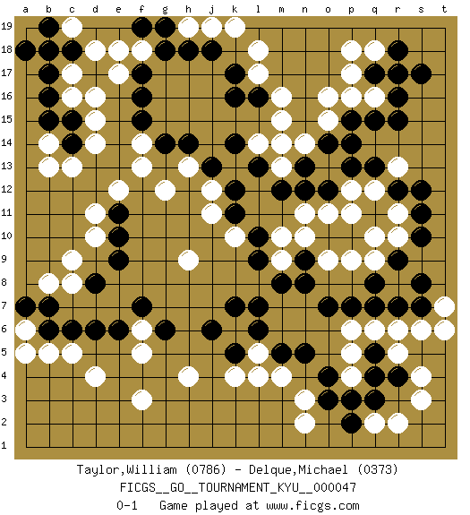 Last move : 0-1 2008 March 27 13:39:3 [Event "FICGS__GO__TOURNAMENT_KYU__000047"] [Site "FICGS"] [Date "2007.10.15"] [Round "1"] [Black "Taylor,William"] [White "Delque,Michael"] [Result "0-1"] [Rating 1 "0786"] [Rating 2 "0373"] 1.q3 d4 2.r16 p16 3.p15 q16 4.q15 r17 5.r15 o16 6.s17 d16 7.r18 q18 8.q17 p17 9.q10 r5 10.r7 p5 11.o4 s3 12.r17 k4 13.n5 r2 14.o7 o15 15.o14 n14 16.n13 o13 17.p14 m13 18.n12 m15 19.m12 k10 20.l13 m14 21.k12 d10 22.f17 e17 23.f16 d14 24.k16 l17 25.l16 m16 26.k17 l18 27.c6 c5 28.d6 f3 29.d8 c9 30.e10 d11 31.e9 j11 32.r4 s4 33.q5 q6 34.q4 r6 35.q7 p6 36.p7 p4 37.p3 n3 38.o3 m4 39.m5 l5 40.l6 k6 41.l7 m10 42.k7 j12 43.j13 g12 44.j6 h4 45.k5 l4 46.g14 f13 47.g6 h9 48.c15 d15 49.c14 c13 50.b17 c16 51.b16 b14 52.b15 b13 53.c18 d18 54.a18 c19 55.b19 c17 56.b18 f18 57.g18 o9 58.n9 n10 59.o10 o11 60.p10 n11 61.o12 p11 62.q11 p12 63.p13 q12 64.r12 r13 65.q13 r11 66.s12 r10 67.r9 q9 68.s10 p9 69.s11 h19 70.f19 e18 71.h18 j19 72.j18 k19 73.g19 f14 74.f15 b5 75.b6 b8 76.e11 e12 77.n8 q2 78.p2 s6 79.s7 t6 80.l9 m9 81.m8 p18 82.l10 q10 83.k11 h13 84.h14 f6 85.f7 f5 86.e6 l14 87.k14 n2 88.q8 t7 89.s8 a6 90.a7 a5 91.b7 c8 0-1 Here are the names of the openings (joseki) played in the four corners : Corner q16 : r16 p16 Komoku (Somok, Xiao~mu`) 3-4 Point. The komoku (3-4) point is the traditional corner enclosure move.. Ikken Takagakari (Hankan Nop'dakeolch'im, Yi Gaogua`jiao~, 1-Space High Approach). The 5-4 approach move has become more popular in modern times, as modern Go emphasizes speed and influence. Corner q4 : q3 r5 Komoku (Somok, Xiao~mu`) 3-4 Point. The komoku (3-4) point is the traditional corner enclosure move.. Ikken Kakari (Hankan Keolch'im, Yi Gua`jiao~, 1-Space Low Pincer). The small knight move is the basic approach move to the 3-4 point stone. It has been continually used for over four centuries. There are limitless variations, with new moves constantly being discovered. White 2 opens the door to a treaure store of joseki. Corner d16 : d16 f17 Hoshi (Hwajeom, Seongjeom, Xingwei`) 4-4 Point. The star or hoshi (4-4) point, emphasizing influence at the potential expense of territory. Ikken Kakari (Hankan Keolch'im, Yi Gua`jiao~, 1-Space Low Approach). Black 2 is the standard approach move to the 4-4. Corner d4 : d4 c6 Hoshi (Hwajeom, Seongjeom, Xingwei`) 4-4 Point. The star or hoshi (4-4) point, emphasizing influence at the potential expense of territory. Ikken Kakari (Hankan Keolch'im, Yi Gua`jiao~, 1-Space Low Approach). Black 2 is the standard approach move to the 4-4. Player White won this Go (weiqi, baduk) game. Follow this game move after move (download)The comb formation is alive. (Anonymous) I would love to change the world, but they won't give me the source code. (Unknown)