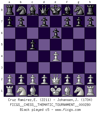 Last move : c5 2026 March 20 17:48:28 Eliecer Cruz Ramirez ... is in vacation until 2026 April 8 23:40:47 White clock - 40 days 00:00:00 Black clock - 39 days 23:56:05 [Event "FICGS__CHESS__THEMATIC_TOURNAMENT__000280"] [Site "FICGS"] [Date "2026.03.20"] [Round "1"] [White "Cruz Ramirez,Eliecer"] [Black "Johansen,Jorgen"] [Result "*"] [WhiteElo "2211"] [BlackElo "1734"] 1.e4 e6 2.Qe2 c5 3.* Follow this game move after move (download)It is difficult to play against Einstein's theory --on his first loss to Fischer. (Mikhail Tal) Die FIDE ist dabei in die Hände der russischen Mafia zu fallen. (Larry Evans) Por la belleza de sus partidas, la claridad de su juego y lo brillante de sus ideas, Fischer se creó el mismo como un artista de la misma estatura como Brahms, Rembrandt y Shakespeare. (David Levy) Les Echecs ne sont pas pour les âmes timides. Ils requièrent un homme entier, qui ne s'arrête pas aveuglément à ce qui a été déjà établi, mais qui tente individuellement de sonder les profondeurs du jeu. (W. Steinitz) You can only get smarter by playing a smarter opponent. (Revolver, movie)