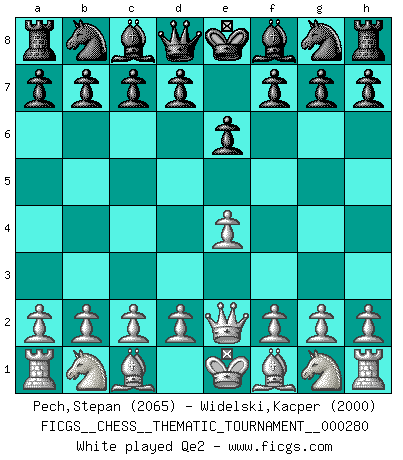 Last move : Qe2 2026 March 20 17:44:33 Stepan Pech ... is in vacation until 2026 March 21 5:1:57 White clock - 40 days 00:00:00 Black clock - 39 days 18:08:27 [Event "FICGS__CHESS__THEMATIC_TOURNAMENT__000280"] [Site "FICGS"] [Date "2026.03.20"] [Round "1"] [White "Pech,Stepan"] [Black "Widelski,Kacper"] [Result "*"] [WhiteElo "2065"] [BlackElo "2000"] 1.e4 e6 2.Qe2 * Follow this game move after move (download)The way he plays Chess demonstrates a man's whole nature. (Stanley Ellin) Offener Brief an US-Präsident Bush anlässlich der Verhaftung Bobby Fishers: Verhaften Sie mich. Stecken Sie mich in dieselbe Zelle wie Bobby Fisher und geben Sie uns ein Schachspiel mit. (Boris Vassilievich Spassky) En manos de Fischer's, una diminuta ventaja teórica es tan buena como tener una Reina de ventaja. (Isaac Kashdan) Vous savez, camarade Pachman, je n'éprouve pas de plaisir à être ministre, je jouerais plutôt aux échecs comme vous, ou alors ferais une révolution au Venezuela. (Che Guevara à Ludek Pachman, 'Checkmate in Prague', 1975) I'm extremely disappointed. I send you out for exciting, new designer drugs, you come back with tomato sauce. (Gregory House, House M.D.)