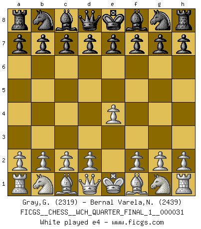 Last move : e4 2026 March 21 23:35:17 White clock - 29 days 23:49:39 Black clock - 28 days 05:30:21 [Event "FICGS__CHESS__WCH_QUARTER_FINAL_1__000031"] [Site "FICGS"] [Date "2026.03.20"] [Round "4"] [White "Gray,Garvin"] [Black "Bernal Varela,Nelson"] [Result "*"] [WhiteElo "2319"] [BlackElo "2439"] 1.e4 * Follow this game move after move (download)A strong memory, concentration, imagination, and a strong will is required to become a great Chess player. (Bobby Fischer) Sie bekommen vielleicht den Eindruck, dass die Spitzenspieler überhaupt gar nicht so stark sind. Aber das stimmt nicht. Es ist eine Illusion. Mit einem Computer an der Seite ist es sehr leicht, Urteile zu fällen, aber wenn man alleine am Brett sitzt, sieht die Sache ganz anders aus. (Vladimir Kramnik) Puntos débiles o agujeros en la posición de tu oponente deben de ser ocupados por piezas, no Peones. (Siegbert Tarrasch) On peut tirer plus d'utilité d'une partie perdue que de 100 parties gagnées. (Capablanca) They misunderestimated me. (George W. Bush, Bentonville nov. 6, 2000)