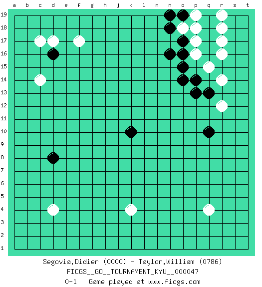 Last move : 0-1 2007 December 16 21:9:4 [Event "FICGS__GO__TOURNAMENT_KYU__000047 "] [Site "FICGS"] [Date "2007.10.15"] [Round "1"] [Black "Segovia,Didier "] [White "Taylor,William "] [Result "0-1"] [Rating 1 "0000"] [Rating 2 "0786"] 1.k10 d4 2.d16 q4 3.q10 k4 4.d8 r16 5.n16 p16 6.n19 f17 7.o14 c14 8.p14 c17 9.o16 p17 10.o17 o18 11.n18 p18 12.o19 p19 13.o15 r14 14.p13 d17 15.q16 q15 16.q17 r17 17.q18 r18 18.q19 r19 19.q13 r12 0-1 This go game has been lost on time (started : 2007.10.15 16:28:57) Here are the names of the openings (joseki) played in the four corners : Corner d4 : d4 d8Hoshi (Hwajeom, Seongjeom, Xingwei`) 4-4 Point. The star or hoshi (4-4) point, emphasizing influence at the potential expense of territory. Corner q16 : r16 n16Komoku (Somok, Xiao~mu`) 3-4 Point. The komoku (3-4) point is the traditional corner enclosure move.. Corner d16 : d16 f17Hoshi (Hwajeom, Seongjeom, Xingwei`) 4-4 Point. The star or hoshi (4-4) point, emphasizing influence at the potential expense of territory.Ikken Kakari (Hankan Keolch'im, Yi Gua`jiao~, 1-Space Low Approach). White 2 is the standard approach move to the 4-4. Corner q4 : q4 0-1Hoshi (Hwajeom, Seongjeom, Xingwei`) 4-4 Point. The star or hoshi (4-4) point, emphasizing influence at the potential expense of territory. Player White won this Go (weiqi, baduk) game.Follow this game move after move (download ) Big groups never die. (Anonymous) Chess is everything: art, science and sport. (Anatoly Karpov)