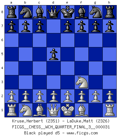 Last move : Nf3 2026 March 21 1:24:20 White clock - 30 days 22:01:04 Black clock - 28 days 23:56:24 [Event "FICGS__CHESS__WCH_QUARTER_FINAL_3__000031"] [Site "FICGS"] [Date "2026.03.20"] [Round "1"] [White "Kruse,Herbert"] [Black "LaDuke,Matt"] [Result "*"] [WhiteElo "2351"] [BlackElo "2326"] 1.Nf3 * Follow this game move after move (download)You sit at the board and suddenly your heart leaps. Your hand trembles to pick up the piece and move it. But what Chess teaches you is that you must sit there calmly and think about whether it's really a good idea and whether there are other better ideas. (Stanley Kubrick) Schach ist Krieg, im Schach geht es um testosterongesteuerte Urschreie. (Garry Kasparov) Del Ajedrez se ha dicho que la vida no es lo suficientemente larga para él, pero eso es culpa de la vida, no del Ajedrez. (William Ewart Napier) Ce n'est pas pour s'amuser qu'il joue aux échecs : il célèbre un culte. (Vladimir Nabokov) At last I discovered the true beauty of chess. So I proposed to her. (Dinesh De Silva)