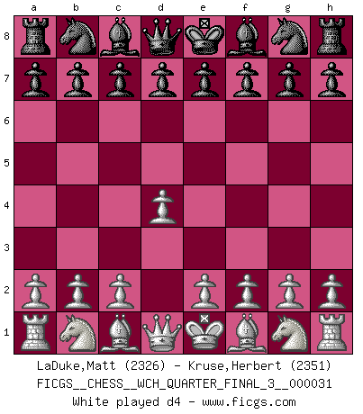 First move 2026 March 20 23:25:24 White clock - 28 days 21:57:28 Black clock - 30 days 00:00:00 [Event "FICGS__CHESS__WCH_QUARTER_FINAL_3__000031"] [Site "FICGS"] [Date "2026.03.20"] [Round "4"] [White "LaDuke,Matt"] [Black "Kruse,Herbert"] [Result "*"] [WhiteElo "2326"] [BlackElo "2351"] 1.* Follow this game move after move (download)The older I grow, the more I value pawns. (Paul Keres) Ich glaube, ich kenne inzwischen die Gründe für mein Versagen: schachliche Charakterfehler. Ich war nie ein Wunderkind und in meiner gesamten menschlichen Entwicklung immer zu langsam. (Viktor Kortschnoi) El Ajedrez es de 30 a 40 por ciento psicología. Uno no cuenta con esto cuando se juega contra una computadora. No lo puedo confundir. (Judith Polgar) Karpov est une pièce de musée. (Garry Kasparov) Are you threatening me, Master Jedi ? (Chancellor Palpatine in Star Wars ep.3)
