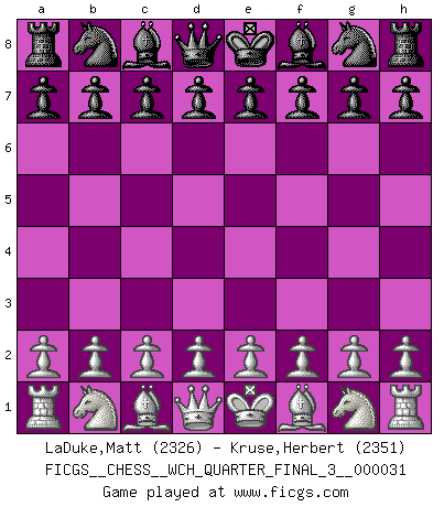 First move 2026 March 20 23:25:24 White clock - 28 days 22:49:21 Black clock - 30 days 00:00:00 [Event "FICGS__CHESS__WCH_QUARTER_FINAL_3__000031"] [Site "FICGS"] [Date "2026.03.20"] [Round "8"] [White "LaDuke,Matt"] [Black "Kruse,Herbert"] [Result "*"] [WhiteElo "2326"] [BlackElo "2351"] 1.* Follow this game move after move (download)Of all my Russian books, the defense contains and diffuses the greatest 'warmth' which may seem odd seeing how supremely abstract Chess is supposed to be. (Vladimir Nabokov) Ein Schachspiel besteht aus drei Phasen: Die erste, wenn du hofftst den Vorteil zu haben, die zweite, wenn du glaubst einen Vorteil zu haben, und die dritte.... wenn du weißt Du wirst verlieren. (Savielly Grigorievitsch Tartakower) El Ajedrez se juega con la mente... ¡no con las manos!. (Renaud y Kahn) On peut tirer plus d'utilité d'une partie perdue que de 100 parties gagnées. (Capablanca) I don't diet. I just don't eat as much as I'd like to. (Linda Evangelista, supermodel)