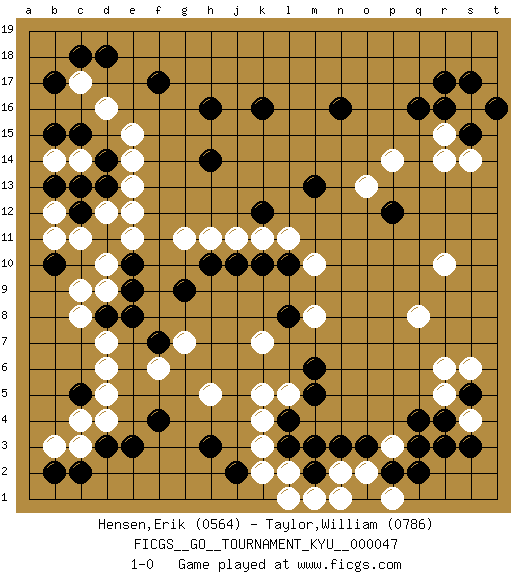 Last move : 1-0 2008 April 7 7:7:51 [Event "FICGS__GO__TOURNAMENT_KYU__000047"] [Site "FICGS"] [Date "2007.10.15"] [Round "1"] [Black "Hensen,Erik"] [White "Taylor,William"] [Result "1-0"] [Rating 1 "0564"] [Rating 2 "0786"] 1.q16 d4 2.q4 d16 3.f17 c14 4.k16 r10 5.d18 c17 6.f4 d6 7.h16 k3 8.c12 c9 9.d3 c3 10.e3 e12 11.c2 b3 12.n16 r6 13.c5 d5 14.d11 e11 15.b2 c4 16.o3 s4 17.d8 d9 18.r3 q8 19.e8 c8 20.d13 e14 21.e9 d7 22.e10 d10 23.d14 e15 24.c15 e13 25.b10 c11 26.c18 b14 27.b15 b12 28.b13 d12 29.c13 b11 30.b17 k5 31.l4 k4 32.l3 f6 33.m6 k7 34.h3 r14 35.g9 g11 36.h10 h11 37.k10 s16 38.r17 m8 39.k12 p14 40.s17 l5 41.m5 j11 42.j10 k11 43.l10 l11 44.m13 m10 45.s3 l2 46.m2 k2 47.s15 s14 48.s5 s6 49.r4 r5 50.r16 r15 51.t16 n2 52.m3 m1 53.n3 o2 54.p2 l1 55.p12 o13 56.h14 h5 57.j2 p3 58.q3 p1 59.q2 n1 60.f7 g7 61.l8 1-0 This go game has been lost on time (started : 2007.10.15 16:28:57) Here are the names of the openings (joseki) played in the four corners : Corner d16 : d16 f17 Hoshi (Hwajeom, Seongjeom, Xingwei`) 4-4 Point. The star or hoshi (4-4) point, emphasizing influence at the potential expense of territory. Ikken Kakari (Hankan Keolch'im, Yi Gua`jiao~, 1-Space Low Approach). Black 2 is the standard approach move to the 4-4. Corner d4 : d4 f4 Hoshi (Hwajeom, Seongjeom, Xingwei`) 4-4 Point. The star or hoshi (4-4) point, emphasizing influence at the potential expense of territory. Ikken Takagakari (Hankan Nop'dakeolch'im, Yi Gaojia, 1-Space High Approach). White typically responds at 6-4 or 3-10. White 4-10 is played when White finds play on the right side advantageous. White 4-8 or 3-8 may be played when White has support at top. Corner q4 : q4 r6 Hoshi (Hwajeom, Seongjeom, Xingwei`) 4-4 Point. The star or hoshi (4-4) point, emphasizing influence at the potential expense of territory. Ikken Kakari (Hankan Keolch'im, Yi Gua`jiao~, 1-Space Low Approach). White 2 is the standard approach move to the 4-4. Player Black won this Go (weiqi, baduk) game. Follow this game move after move (download)Go is essentially a form of harmony. Go in the 21st century will have to be go of the 'harmony of the six points - the four quarters, the above and the below.' As in life we will need to view the whole rather than the part. Japanese go has focused too heavily on the local (joseki) rather than the whole for 300 years. The reason the Chinese and Koreans are overtaking the Japanese is that they are closer to achieve this whole-board view. (Go Seigen, 9p, 1994) A good player is always lucky. (Capablanca)
