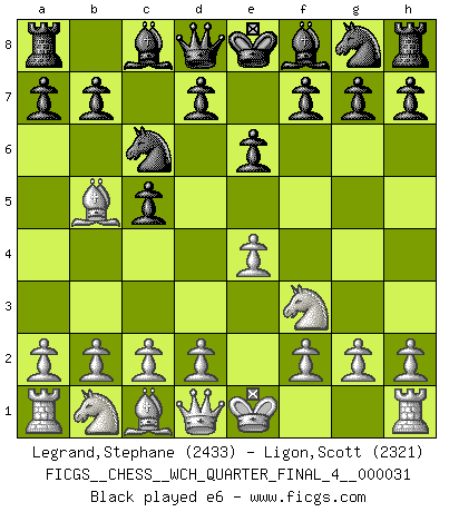 Last move : e6 2026 March 21 17:6:6 White clock - 32 days 01:46:35 Black clock - 32 days 22:51:23 [Event "FICGS__CHESS__WCH_QUARTER_FINAL_4__000031"] [Site "FICGS"] [Date "2026.03.20"] [Round "3"] [White "Legrand,Stephane"] [Black "Ligon,Scott"] [Result "*"] [WhiteElo "2433"] [BlackElo "2321"] 1.e4 c5 2.Nf3 Nc6 3.Bb5 e6 4.* Follow this game move after move (download)An attack on the wing should be met by play in the center. (Nimzovitch) Der Schachmeister von Heute braucht Courage, einen Killerinstinkt, Ausdauer und Arroganz. (Larry Evans) Te sientas frente a un tablero y repentinamente tu corazón brinca. Tu mano tiembla al tomar una pieza y moverla. Pero lo que el Ajedrez te enseña es que tu debes permanecer ahí con calma y pensar de que si realmente es una buena idea o de que si hay otras ideas mejores. (Stanley Kubrick) Il a essayé de se convaincre qu'il pourrait empêcher toutes les erreurs et ne jamais perdre. L'horreur ! Gary Kasparov au sujet de Robert Fischer. There are two types of people in this world, good and bad. The good sleep better, but the bad seem to enjoy the waking hours much more. (Woody Allen)