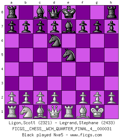 Last move : Bf1 2026 March 21 17:49:55 White clock - 36 days 21:19:47 Black clock - 35 days 03:18:12 [Event "FICGS__CHESS__WCH_QUARTER_FINAL_4__000031"] [Site "FICGS"] [Date "2026.03.20"] [Round "6"] [White "Ligon,Scott"] [Black "Legrand,Stephane"] [Result "*"] [WhiteElo "2321"] [BlackElo "2433"] 1.e4 e5 2.Nf3 Nc6 3.Bb5 Nf6 4.O-O Nxe4 5.Re1 Nd6 6.Nxe5 Be7 7.Bf1 * Follow this game move after move (download)Chess is above all, a fight ! (Emanuel Lasker) Wenn Schach ein enormer Dschungel ist, der seine Myriaden von Geheimnissen nicht preisgeben will, dann sind Computer die Kettensägen einer gewaltigen ökologisch unsensiblen Nutzholzfirma. (Nigel Short) ¿Que sería del Ajedrez sin errores graciosos?. (Kurt Richter) Les Echecs représentent une sphère d'idées créatrices basée sur la volonté des deux protagonistes. (Smyslov) A specialist learns more and more about less and less until he knows everything about nothing. (Nicholas Murray Butler)