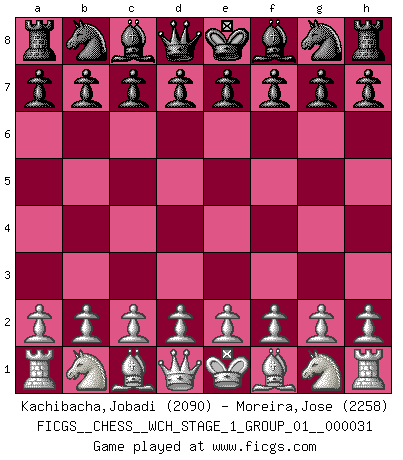 First move 2026 March 20 23:30:55 White clock - 29 days 03:48:35 Black clock - 30 days 00:00:00 [Event "FICGS__CHESS__WCH_STAGE_1_GROUP_01__000031"] [Site "FICGS"] [Date "2026.03.20"] [Round "1"] [White "Kachibacha,Jobadi"] [Black "Moreira,Jose"] [Result "*"] [WhiteElo "2090"] [BlackElo "2258"] 1.* Follow this game move after move (download)If I win a tournament, I win it by myself. I do the playing. Nobody helps me. (Bobby Fischer) Wie ich sie so einen nach dem anderen nieder mähte wurde meine Überlegenheit offensichtlich. (José Raúl Capablanca) El juego de Damas es para vagabundos. (Paul Morphy) En blitz, le Cavalier l'emporte sur le Fou. (Vlastimil Hort) The production of too many useful things results in too many useless people. (Karl Marx)