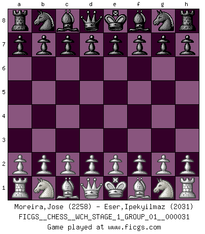 First move 2026 March 20 23:30:55 White clock - 29 days 02:15:24 Black clock - 30 days 00:00:00 [Event "FICGS__CHESS__WCH_STAGE_1_GROUP_01__000031"] [Site "FICGS"] [Date "2026.03.20"] [Round "1"] [White "Moreira,Jose"] [Black "Eser,Ipekyilmaz"] [Result "*"] [WhiteElo "2258"] [BlackElo "2031"] 1.* Follow this game move after move (download)There are two classes of men; those who are content to yield to circumstances and who play whist; those who aim to control circumstances, and who play Chess. (Mortimer Collins) Was ist der Unterschied zwischen einem Strassenarbeiter und einem Schachspieler? --Der Schachspieler bewegt sich ab und zu. (Anonymous) Uno no tiene que jugar muy bien, es suficiente jugar mejor que el oponente. (Siegbert Tarrasch) Les Echecs ne sont pas pour les âmes timides. Ils requièrent un homme entier, qui ne s'arrête pas aveuglément à ce qui a été déjà établi, mais qui tente individuellement de sonder les profondeurs du jeu. (W. Steinitz) Every now and then a man's mind is stretched by a new idea and never shrinks back to its former dimensions. (Oliver Wendell Holmes, Sr.)