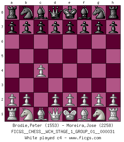 Last move : c4 2026 March 21 11:21:38 White clock - 30 days 12:09:17 Black clock - 29 days 17:28:14 [Event "FICGS__CHESS__WCH_STAGE_1_GROUP_01__000031"] [Site "FICGS"] [Date "2026.03.20"] [Round "1"] [White "Brodie,Peter"] [Black "Moreira,Jose"] [Result "*"] [WhiteElo "1553"] [BlackElo "2258"] 1.c4 * Follow this game move after move (download)Openings teach you openings. Endgames teach you chess ! (Stephan Gerzadowicz) Es ist besser die Steine des Gegners zu opfern. (Savielly Grigorievitsch Tartakower) Debes de llevar a tu oponente hacia un profundo y obscuro bosque donde 2+2=5, y el camino que conduce a la salida es suficientemente ancho para solamente uno. (Mikhail Tal) Shah mat. Le roi est mort. Cri de fierté d'un joueur venant de terrasser son adversaire, courtoisement, sans effusion de sang. Real knowledge is to know the extent of one's ignorance. (Confucius)