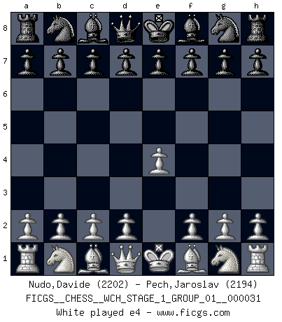 First move 2026 March 20 23:30:55 White clock - 29 days 07:21:35 Black clock - 30 days 00:00:00 [Event "FICGS__CHESS__WCH_STAGE_1_GROUP_01__000031"] [Site "FICGS"] [Date "2026.03.20"] [Round "1"] [White "Nudo,Davide"] [Black "Pech,Jaroslav"] [Result "*"] [WhiteElo "2202"] [BlackElo "2194"] 1.* Follow this game move after move (download)I'd rather have a Pawn than a finger. (Reuben Fine) Man kann eine Schachpartie nur gewinnen, wenn das Gleichgewicht gestört ist. In einer Stellung mit ungestörtem Gleichgewicht ist auch das größte Genie hilflos - in der Stellung steckt dann eben kein genialer Einfall. (Wilhelm Steinitz) La batalla por la última verdad nunca sera ganada. Y es por eso que el Ajedrez es tan fascinante. (Hans Kmoch) Avec des compensations pour le matériel en plus... (Anonyme) Being number two sucks. (Andre Agassi)