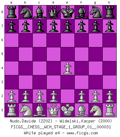 Last move : e4 2026 March 21 17:12:0 White clock - 30 days 06:18:55 Black clock - 29 days 19:56:55 [Event "FICGS__CHESS__WCH_STAGE_1_GROUP_01__000031"] [Site "FICGS"] [Date "2026.03.20"] [Round "1"] [White "Nudo,Davide"] [Black "Widelski,Kacper"] [Result "*"] [WhiteElo "2202"] [BlackElo "2000"] 1.e4 * Follow this game move after move (download)There must have been a time when men were demigods, or they could not have invented Chess. (Gustav Schenk) Habe Mut, dich deines eigenen Verstandes zu bedienen. (Immanuel Kant) Antes de los Finales, los dioses han colocado el Juego Medio. (Siegbert Tarrasch) Il s'avisa de me proposer d'apprendre les échecs qu'il jouait un peu... me voilà forcené des échecs. J'achète un échiquier, je m'enferme dans ma chambre, j'y passe des jours et des nuits à vouloir apprendre par cur toutes les parties. (Jean-Jacques Rousseau, Confessions) SEO proverb : Make your website optimized for human beings, not for search engines.