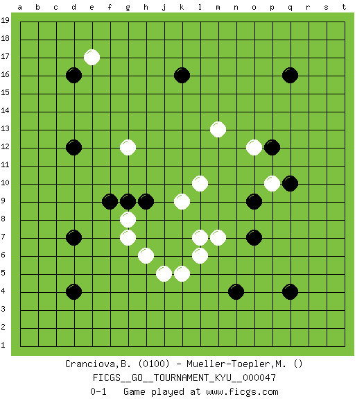 Last move : 0-1 2007 December 5 8:21:54 [Event "FICGS__GO__TOURNAMENT_KYU__000047"] [Site "FICGS"] [Date "2007.10.15"] [Round "1"] [Black "Cranciova,Bogdan"] [White "Mueller-Toepler,Michael"] [Result "0-1"] [Rating 1 "0100"] 1.q16 e17 2.d16 j5 3.d4 g12 4.q4 l10 5.d12 m13 6.k16 l6 7.q10 p10 8.n4 k5 9.d7 h6 10.f9 g7 11.h9 g8 12.g9 l7 13.o7 m7 14.o9 k9 15.p12 o12 0-1 This go game has been lost on time (started : 2007.10.15 16:28:57) Here are the names of the openings (joseki) played in the four corners : Corner d16 : e17 d16 Mokuhazushi (Waemok, Wai`mu`) 5-3 Point. The mokuhazushi (5-3) point was popular in the Edo period in Japan (1600 - 1867). It emphasizes influence; territorially, it is inferior to the 3-4 point. Corner d4 : j5 d4 This joseki is unknown. A weak or weird move has probably been played in this corner. Corner q16 : q16 m13 Hoshi (Hwajeom, Seongjeom, Xingwei`) 4-4 Point. The star or hoshi (4-4) point, emphasizing influence at the potential expense of territory. Corner q4 : q4 l6 Hoshi (Hwajeom, Seongjeom, Xingwei`) 4-4 Point. The star or hoshi (4-4) point, emphasizing influence at the potential expense of territory. Player White won this Go (weiqi, baduk) game. Follow this game move after move (download)If there is no stone on the handicap point, the carpenter's square is dead. (Anonymous) Excelling at chess has long been considered a symbol of more general intelligence. That is an incorrect assumption in my view, as pleasant as it might be. But for the purposes of argument and investigation, chess is, in Russkin-Gutman's words, 'an unparalleled laboratory, since both the learning process and the degree of ability obtained can be objectified and quantified, providing an excellent comparative framework on which to use rigorous analytical techniques.' (The Chess Master and the Computer, by Garry Kasparov - 2010)