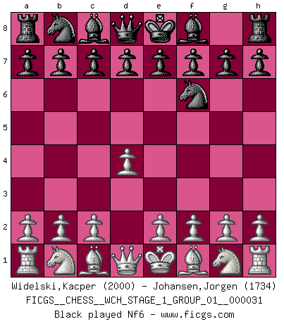 Last move : Nf6 2026 March 21 11:17:21 White clock - 30 days 03:42:11 Black clock - 30 days 14:01:55 [Event "FICGS__CHESS__WCH_STAGE_1_GROUP_01__000031"] [Site "FICGS"] [Date "2026.03.20"] [Round "1"] [White "Widelski,Kacper"] [Black "Johansen,Jorgen"] [Result "*"] [WhiteElo "2000"] [BlackElo "1734"] 1.d4 Nf6 2.* Follow this game move after move (download)Chess is a terrible game. If you have no center, your opponent has a freer position. If you do have a center, then you really have something to worry about ! (Siegbert Tarrasch) Die meiste Zeit treffe ich auf Gegner, die meine Enkel sein könnten. Ich bin da, um ihnen zu zeigen, dass sie von mir noch einiges lernen können. (Viktor Kortschnoi) El Ajedrez es la vida. (Bobby Fischer) Les échecs c'est le défi de l'alpiniste, toujours plus haut, prêt à tout pour monter à l'assaut du Roi ennemi. Les échecs, c'est de la musique en mouvement, un ballet majestueux pour les yeux. C'est de la poésie composée par les fantômes du passé qui au même titre que Rimbaud ou Verlaine méritent notre admiration. Les échecs, c'est de la peinture ou le moindre mouvement modifie le tableau pour en faire un Picasso ou un Van Gogh. Les échecs, c'est tout et rien, c'est la vie et la mort. Jjulie33 sur le forum de France-Echecs. Internal peace cannot coexist with external war. (Don Groves)