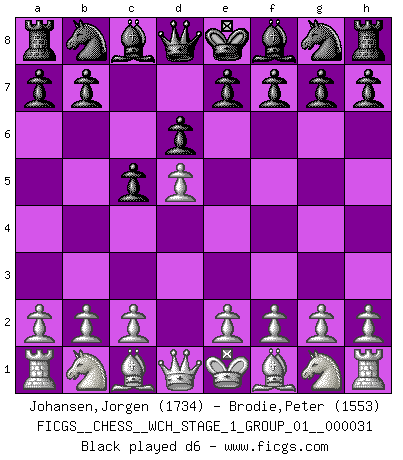 Last move : d6 2026 March 21 16:12:56 White clock - 31 days 01:32:42 Black clock - 31 days 19:35:45 [Event "FICGS__CHESS__WCH_STAGE_1_GROUP_01__000031"] [Site "FICGS"] [Date "2026.03.20"] [Round "1"] [White "Johansen,Jorgen"] [Black "Brodie,Peter"] [Result "*"] [WhiteElo "1734"] [BlackElo "1553"] 1.d4 c5 2.d5 d6 3.* Follow this game move after move (download)Chess is the art of analysis. (Mikhail Botvinnik) Frage des Reporters: -Welche besonderen Umstände rechtfertigen das Anhalten der Uhren während einer Turnierpartie? Antwort: -Einen Fotographen zu strangulieren. (Siegbert Tarrasch) El Ajedrez es en su esencia, un juego. En su forma, un arte. Y en su ejecución, una ciencia. (Baron Tassilo) Karpov est une pièce de musée. (Garry Kasparov) At work, the authority of a person is inversely proportional to the number of pens that person is carrying. (Dan Rotaru)