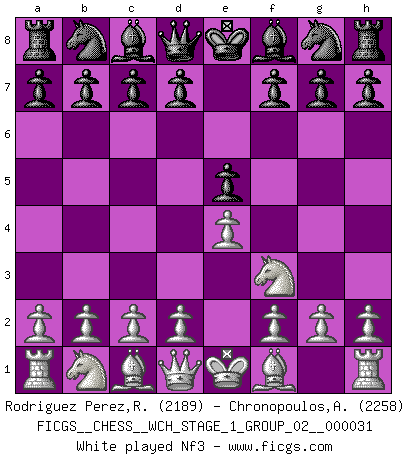 Last move : Nf3 2026 March 21 21:55:0 White clock - 31 days 18:39:26 Black clock - 30 days 05:54:55 [Event "FICGS__CHESS__WCH_STAGE_1_GROUP_02__000031"] [Site "FICGS"] [Date "2026.03.20"] [Round "1"] [White "Rodriguez Perez,Rene"] [Black "Chronopoulos,Antonis"] [Result "*"] [WhiteElo "2189"] [BlackElo "2258"] 1.e4 e5 2.Nf3 * Follow this game move after move (download)Via the squares on the chessboard, the Indians explain the movement of time and the age, the higher influences which control the world and the ties which link Chess with the human soul. (Al-Masudi) Es ist besser die Steine des Gegners zu opfern. (Savielly Grigorievitsch Tartakower) Las combinaciones han sido siempre el aspecto más intrigante del Ajedrez. Los Maestros las buscan, el público las aplauden, los críticos las alaban. La razón se debe a que las combinaciones hacen posible que el Ajedrez sea más que un ejercicio matemático con una carencia de vida. Ellas son la poesía del juego, son del Ajedrez lo que la melodía es de la música. Ellas representan el triunfo de la mente sobre la materia. (Reuben Fine) Ce qui caractérise les parties de combat, c'est que si le défenseur a constamment de difficiles problèmes à résoudre, l'attaquant doit chercher sans relâche de nouvelles possibilités d'attaque. (Koblentz) The faster the computer, the slower the brain. (Thibault de Vassal)