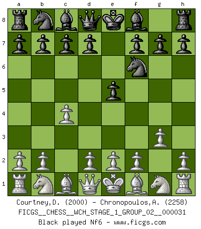 Last move : g3 2026 March 21 18:30:10 White clock - 31 days 10:34:40 Black clock - 30 days 17:13:58 [Event "FICGS__CHESS__WCH_STAGE_1_GROUP_02__000031"] [Site "FICGS"] [Date "2026.03.20"] [Round "1"] [White "Courtney,Daniel"] [Black "Chronopoulos,Antonis"] [Result "*"] [WhiteElo "2000"] [BlackElo "2258"] 1.c4 e5 2.g3 * Follow this game move after move (download)If you aren't afraid of Spassky, then I have removed the element of money. (Jim Slater) Gewöhnliche Menschen denken nur daran, wie sie ihre Zeit verbringen. Ein intelligenter Mensch versucht, sie auszunutzen. (Arthur Schopenhauer) Siempre es mucho mejor sacrificar las piezas de tu oponente. (Savielly Tartakover) La vérité est comme le meilleur coup aux échecs : elle existe, mais il faut la chercher. (Arturo Perez-Reverte) When you've done things right people won't know you've done anything at all. (Futurama)