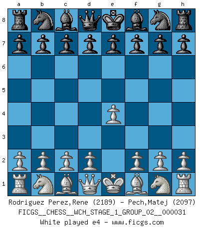 Last move : e4 2026 March 20 23:50:26 White clock - 30 days 23:40:32 Black clock - 29 days 07:44:30 [Event "FICGS__CHESS__WCH_STAGE_1_GROUP_02__000031"] [Site "FICGS"] [Date "2026.03.20"] [Round "1"] [White "Rodriguez Perez,Rene"] [Black "Pech,Matej"] [Result "*"] [WhiteElo "2189"] [BlackElo "2097"] 1.e4 * Follow this game move after move (download)Weak points or holes in the opponent's position must be occupied by pieces not Pawns. (Siegbert Tarrasch) Zum Sieg gelangt man nicht, wenn man gut, sondern nur wenn man besser spielt (Savielly Grigorievitsch Tartakower) Si pudieramos observar el interior de la cabeza de un jugador de Ajedrez, encontraríamos ahí un mundo lleno de sentimientos, imágenes, ideas, emoción y pasión. (Alfred Binet) Le thème de l'attaque double intervient d'une manière ou d'une autre dans l'immense majorité des combinaisons. (Youri Averbakh) Unless in communicating with it one says exactly what one means, trouble is bound to result. (Alan Turing, about computers)