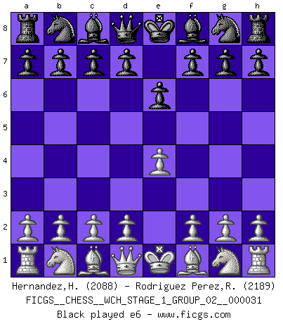 Last move : e6 2026 March 21 11:50:33 White clock - 30 days 15:37:11 Black clock - 30 days 12:11:27 [Event "FICGS__CHESS__WCH_STAGE_1_GROUP_02__000031"] [Site "FICGS"] [Date "2026.03.20"] [Round "1"] [White "Hernandez,Humberto"] [Black "Rodriguez Perez,Rene"] [Result "*"] [WhiteElo "2088"] [BlackElo "2189"] 1.e4 e6 2.* Follow this game move after move (download)Chess is not like life... it has rules ! (Mark Pasternak) Ein typischer, sehr verbreiteter Gedankenschädling ist der, daß der betreffende Amateur von der Annanhme ausgeht, daß jeder einzelne Zug etwas zu leisten habe. (Aaron Nimzowitsch) Cuando tu casa esta en llamas, no puedes ser molestado por tus vecinos. O, como decinos en Ajedrez, si tu Rey esta bajo ataque, no te preocupa perder un Peón del lado de la Reina. (Gary Kasparov) La solitude du joueur d'Echecs à l'approche du mat est semblable à celle du condamné. (Francis Szpiner) Knowledge will give you power, but character respect. (Bruce Lee)