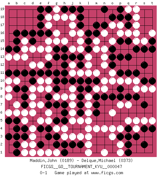Last move : 0-1 2008 May 13 6:7:40 [Event "FICGS__GO__TOURNAMENT_KYU__000047"] [Site "FICGS"] [Date "2007.10.15"] [Round "1"] [Black "Maddin,John"] [White "Delque,Michael"] [Result "0-1"] [Rating 1 "0189"] [Rating 2 "0373"] 1.d16 r16 2.q4 d4 3.f3 d6 4.c3 d3 5.c4 c5 6.b5 b6 7.a5 a6 8.b3 a4 9.b4 c2 10.b2 d2 11.b1 l3 12.n3 h3 13.a3 q10 14.r14 p16 15.p18 o17 16.o18 q14 17.q13 p14 18.p13 q7 19.r11 r10 20.s10 s9 21.t10 c13 22.c7 d7 23.c8 c6 24.c11 c15 25.c16 e14 26.d15 d14 27.b15 f17 28.e18 f15 29.e17 o3 30.o2 o4 31.p3 n4 32.m3 m4 33.m2 l2 34.m1 l1 35.k4 n1 36.n2 p2 37.o1 p1 38.q2 n1 39.q1 g4 40.f4 f5 41.g5 e5 42.g3 h4 43.h2 k3 44.j4 j3 45.j2 r15 46.s14 d8 47.c9 d9 48.d10 e10 49.e11 f10 50.f8 h8 51.h7 j7 52.h6 j6 53.h5 j5 54.g7 f6 55.g10 e9 56.g9 g8 57.f7 j9 58.g11 f9 59.f11 r5 60.s4 r4 61.r3 s5 62.t4 p4 63.q3 q5 64.s2 t9 65.s12 r18 66.q17 r17 67.n17 n16 68.m17 j17 69.k18 j18 70.k17 k16 71.l16 k15 72.k13 l12 73.o8 o10 74.p11 p10 75.m10 n9 76.m7 m9 77.k8 j8 78.l9 l7 79.k7 l6 80.k6 k5 81.k9 l8 82.k10 l13 83.l14 n12 84.n11 m14 85.l15 n14 86.o13 f18 87.f19 h15 88.g14 g15 89.h14 g19 90.e19 g18 91.j19 j14 92.j13 d12 93.d11 e12 94.f12 f13 95.g13 f14 96.k12 l11 97.l10 s15 98.t15 t16 99.t14 o11 100.q11 k11 101.j10 j11 102.h11 a9 103.a11 a13 104.a14 b13 105.b14 c14 106.b16 j12 107.h12 k14 108.h13 m11 109.h10 b10 110.b9 a10 111.b11 a8 112.e4 g1 113.m8 l4 114.m6 l5 115.n8 n10 116.f16 g16 117.e16 t5 118.o14 o15 119.q15 q16 120.p15 m15 121.m16 j16 122.h19 h18 123.k19 p17 124.q18 q19 125.p19 r19 126.n19 c1 127.e2 e1 128.g2 f1 129.h1 d1 130.k2 e7 131.r8 r9 132.q8 o6 133.o12 b7 134.p9 p7 135.p8 n13 136.pass pass 137.s7 pass 138.pass pass 0-1 Here are the names of the openings (joseki) played in the four corners : Corner d4 : d4 f3 Hoshi (Hwajeom, Seongjeom, Xingwei`) 4-4 Point. The star or hoshi (4-4) point, emphasizing influence at the potential expense of territory. Ikken Kakari (Hankan Keolch'im, Yi Gua`jiao~, 1-Space Low Approach). Black 2 is the standard approach move to the 4-4. Corner q4 : q4 l3 Hoshi (Hwajeom, Seongjeom, Xingwei`) 4-4 Point. The star or hoshi (4-4) point, emphasizing influence at the potential expense of territory. Corner q16 : r16 r14 Komoku (Somok, Xiao~mu`) 3-4 Point. The komoku (3-4) point is the traditional corner enclosure move.. Corner d16 : d16 c13 Hoshi (Hwajeom, Seongjeom, Xingwei`) 4-4 Point. The star or hoshi (4-4) point, emphasizing influence at the potential expense of territory. Nikken Kakari (Dukan Keolch'im, E`r Gua`jiao~, 2-Space Low Approach). Black typically answers by 7-3 or 3-5 (which is not joseki). Player White won this Go (weiqi, baduk) game. Follow this game move after move (download)Every move brings change. (Pierre Audouard) Knowledge will give you power, but character respect. (Bruce Lee)