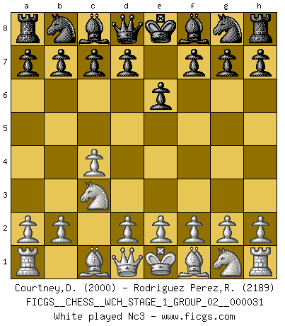Last move : Nc3 2026 March 21 15:38:8 White clock - 31 days 08:22:47 Black clock - 30 days 19:25:50 [Event "FICGS__CHESS__WCH_STAGE_1_GROUP_02__000031"] [Site "FICGS"] [Date "2026.03.20"] [Round "1"] [White "Courtney,Daniel"] [Black "Rodriguez Perez,Rene"] [Result "*"] [WhiteElo "2000"] [BlackElo "2189"] 1.c4 e6 2.Nc3 * Follow this game move after move (download)Castle early and often. (Rob Sillars) Früher wurde jeder komplizierte Zug, jedes interessante Opfer mit großem Beifall und Enthusiasmus aufgenommen. Heute schaltet man einfach seinen Fritz an, und man kann sehen, was los ist, ob der Zug geht oder nicht. (Vladimir Kramnik) Un entendimiento minucioso de las típicas continuaciones de mate hacen de las mas complicadas combinaciones de sacrificio que conducen hacia ellas no solo no dificiles, sino casi un asunto de rutina. (Siegbert Tarrasch) Un journaliste : 'Vous préférez avoir une dame de plus sur l'échiquier ou au lit ?' Boris Spassky : 'Ca dépend de la position.' Somehow our devils are never quite what we expect when we meet them face to face. (Nelson DeMille)