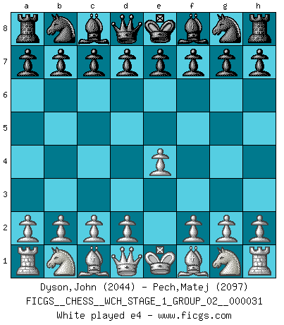 Last move : e4 2026 March 21 14:24:21 White clock - 30 days 09:06:37 Black clock - 29 days 20:30:57 [Event "FICGS__CHESS__WCH_STAGE_1_GROUP_02__000031"] [Site "FICGS"] [Date "2026.03.20"] [Round "1"] [White "Dyson,John"] [Black "Pech,Matej"] [Result "*"] [WhiteElo "2044"] [BlackElo "2097"] 1.e4 * Follow this game move after move (download)The boy (then a 12 year old boy named Anatoly Karpov) doesn't have a clue about Chess, and there's no future at all for him in this profession. (Mikhail Botvinnik) Das Schachspiel hat wie die Liebe, die Musik, die Fähigkeit, den Menschen glücklich zu machen. Ich habe ein leises Gefühl des Bedauerns für jeden, der das Schachspiel nicht kennt, so wie ich jeden bedaure, der die Liebe nicht kennt. (Siegbert Tarrasch) El Ajedrez es un regaderazo frío para la mente. (Sir John Simon) Même un GMI sait rarement calculer sur plus de cinq coups une attaque à sacrifices. (Rudolf Spielmann) Train yourself to let go of everything you fear to lose. (Master Yoda in Star Wars ep.3)