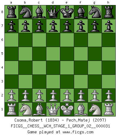 First move 2026 March 20 23:30:58 White clock - 29 days 02:15:53 Black clock - 30 days 00:00:00 [Event "FICGS__CHESS__WCH_STAGE_1_GROUP_02__000031"] [Site "FICGS"] [Date "2026.03.20"] [Round "1"] [White "Csoma,Robert"] [Black "Pech,Matej"] [Result "*"] [WhiteElo "1834"] [BlackElo "2097"] 1.* Follow this game move after move (download)Chess is so inspiring that I do not believe a good player is capable of having an evil thought during the game. (Wilhelm Steinitz) Es hat in meinem Leben Zeiten gegeben, in denen das Schachspiel, wenn nicht zum Lebenszweck, so doch zu einem regelrechten Lebensersatz geworden ist. Man fühlt sich in solchen Zeiten nicht so, als besäße man eine göttliche Gabe, sondern eher so, als sei man von ihr besessen. (Garry Kasparov) Una victoria por una combinación errónea, aunque sea espectacular, me llena de horror artístico. (Wilhelm Steinitz) Un millionnaire : 'Monsieur Steinitz ! Vous ne participez aux tournois que pour l'argent, alors que moi je n'y viens que pour l'honneur.' Steinitz : 'Chacun joue pour ce qu'il n'a pas'... If you are going through hell, keep going. (Winston Churchill)