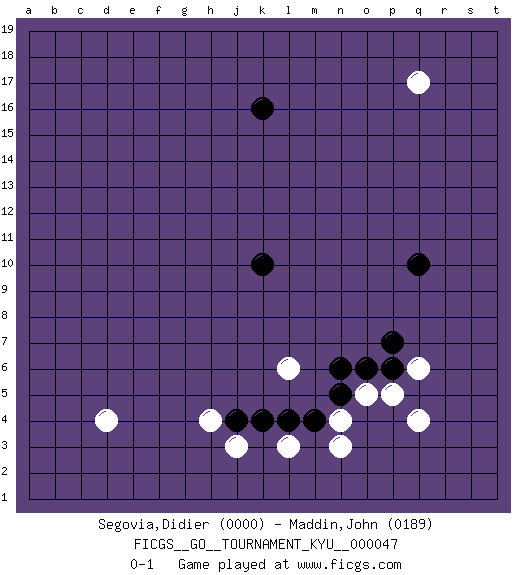 Last move : 0-1 2007 December 10 20:36:41 [Event "FICGS__GO__TOURNAMENT_KYU__000047"] [Site "FICGS"] [Date "2007.10.15"] [Round "1"] [Black "Segovia,Didier"] [White "Maddin,John"] [Result "0-1"] [Rating 1 "0000"] [Rating 2 "0189"] 1.k16 q4 2.q10 q17 3.k10 d4 4.n6 n3 5.k4 j3 6.l4 l3 7.m4 n4 8.j4 h4 9.n5 o5 10.o6 p5 11.p6 q6 12.p7 l6 0-1 This go game has been lost on time (started : 2007.10.15 16:28:57) Here are the names of the openings (joseki) played in the four corners : Corner q4 : q4 n6 Hoshi (Hwajeom, Seongjeom, Xingwei`) 4-4 Point. The star or hoshi (4-4) point, emphasizing influence at the potential expense of territory. Player White won this Go (weiqi, baduk) game. Follow this game move after move (download)In opponents' sphere of influence, avoid sharp conflict, don't move too deep. (Otake Hideo, 9p) To err is human, but to really foul things up requires a computer. (Farmer's Almanac, 1978)