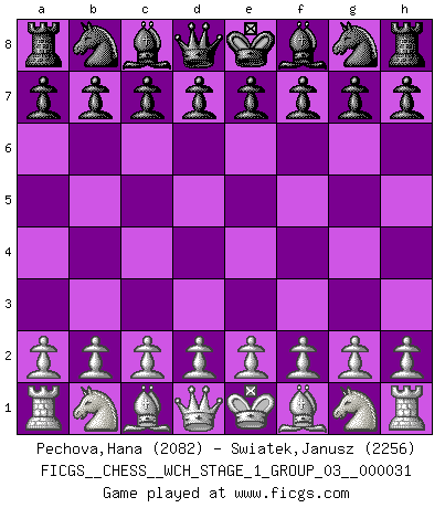First move 2026 March 20 23:31:0 White clock - 29 days 07:54:04 Black clock - 30 days 00:00:00 [Event "FICGS__CHESS__WCH_STAGE_1_GROUP_03__000031"] [Site "FICGS"] [Date "2026.03.20"] [Round "1"] [White "Pechova,Hana"] [Black "Swiatek,Janusz"] [Result "*"] [WhiteElo "2082"] [BlackElo "2256"] 1.* Follow this game move after move (download)A man without frontiers. He didn't divide the East and the West, he brought them together in their admiration for him. (Ljubomir Ljubojevic, about Bobby Fischer's death) Privat ist Kortschnoi kein schlechter Mensch, sehr sympathisch. Aber während des Spiels ist er grausam. Er will dich töten. (Miguel Najdorf) Una victoria por una combinación errónea, aunque sea espectacular, me llena de horror artístico. (Wilhelm Steinitz) Les échecs, c'est la lutte contre l'erreur. (Johannes Zukertort) I don't believe in psychology. I believe in good moves. (Bobby Fischer)