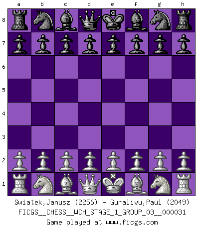 First move 2026 March 20 23:31:0 White clock - 29 days 02:21:46 Black clock - 30 days 00:00:00 [Event "FICGS__CHESS__WCH_STAGE_1_GROUP_03__000031"] [Site "FICGS"] [Date "2026.03.20"] [Round "1"] [White "Swiatek,Janusz"] [Black "Guralivu,Paul"] [Result "*"] [WhiteElo "2256"] [BlackElo "2049"] 1.* Follow this game move after move (download)Chess is thirty to forty percent psychology. You don't have this when you play a computer. I can't confuse it. (Judith Polgar) Es gibt nur zwei wahre Schachgenies - das andere war Wilhelm Steinitz, der Weltmeister von 1872 bis 1894. (Robert James Fischer) Fischer era un maestro de claridad y un Rey del posicionamiento astuto. Sus oponentes podían ver hacia donde se dirigía pero eran impotentes para detenerlo. (Bruce Pandolfini) Pour moi, les échecs ne sont pas un jeu mais un art. (Alexandre Alekhine) When you have everything, sometimes it feels like nothing. (Horatio Caine, C.S.I. Miami)