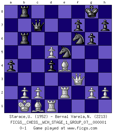 Last move : 0-1 2006 September 9 11:26:41 [Event "FICGS__CHESS__WCH_STAGE_1_GROUP_07__000001"] [Site "FICGS"] [Date "2006.07.01"] [Round "1"] [White "Starace,Umberto"] [Black "Bernal Varela,Nelson"] [Result "0-1"] [WhiteElo "1952"] [BlackElo "2213"] 1.e4 c5 2.Nf3 d6 3.d4 cxd4 4.Nxd4 Nf6 5.Nc3 a6 6.Bg5 e6 7.f4 Qb6 8.Nb3 Be7 9.Qf3 Nbd7 10.O-O-O Qc7 11.Bd3 b5 12.a3 Rb8 13.Rhe1 b4 14.axb4 Rxb4 15.Kb1 Bb7 16.Qh3 e5 17.Na2 Rb6 18.Nc3 O-O 19.Nd5 Bxd5 20.exd5 g6 21.Qf3 Rfb8 22.fxe5 dxe5 23.Bc1 Bb4 24.Re3 a5 25.Nd2 Bc5 26.Re2 Bd4 27.Nb3 a4 28.Nxd4 exd4 29.Be4 Ne5 0-1 Sicilian : Najdorf, 7...Qb6 Queenside Castling by player White (move 10) Kingside Castling by player Black (move 18) Player Black won this chess game. Follow this game move after move (download)Chess is a terrible game. If you have no center, your opponent has a freer position. If you do have a center, then you really have something to worry about ! (Siegbert Tarrasch) Der vorletzte Fehler gewinnt. (Savielly Grigorievitsch Tartakower) Debemos de asegurarnos de que el Ajedrez no se convierta en un lenguaje muerto, muy interesante, pero solo para un grupo muy pequeño. (Sytze Faber) Le joueur d'Echecs qui veut atteindre le top est obligé de développer son propre credo créatif. Alexeï Stepanovicth Souétine. Il est facile d'écrire des livres ! Ce qui est difficile, c'est de jouer ! (Alexeï Stepanovicth Souétine) The only difference between a tax man and a taxidermist is that the taxidermist leaves the skin. (Mark Twain)